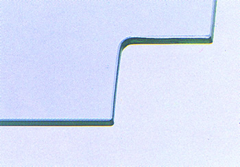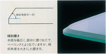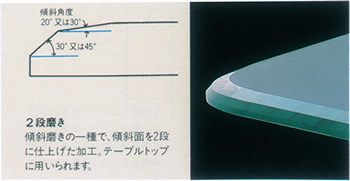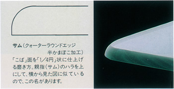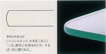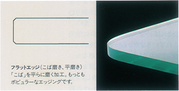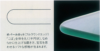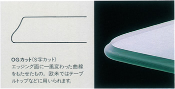平磨きといわれるフラットエッジが一般的ですが、この「OGカット」などいろんな形状があります。エッジングのほか傾斜磨きとかベベリングといって、木口を幅広く平滑に処理する方法もあり、ガラスによる表現に豊かな変化を与えています。