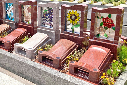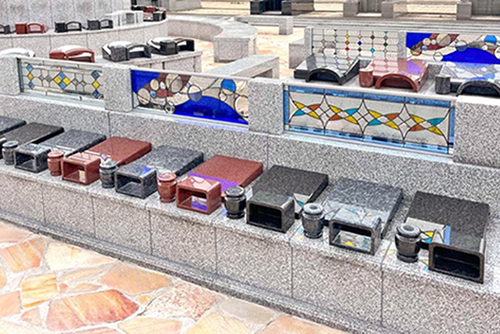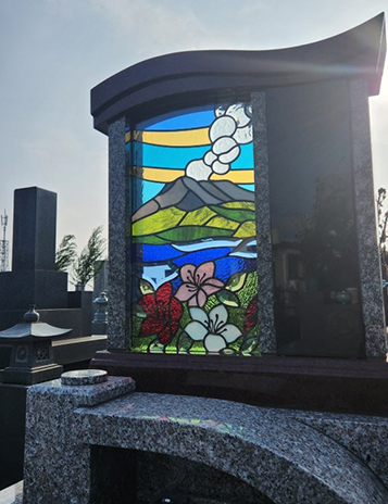 墓石への組み込みはもちろん、霊園内の仕切りやモニュメント、建築物のインテリア、エクステリアとしても採用されています。三層構造の最背面に鏡を配備したミラーステンドは、光が通らなくても美しい輝きを放つ特許出願済みの技術で、建物のサイン・看板の他、遺骨が納められている納骨堂などにも採用されています。